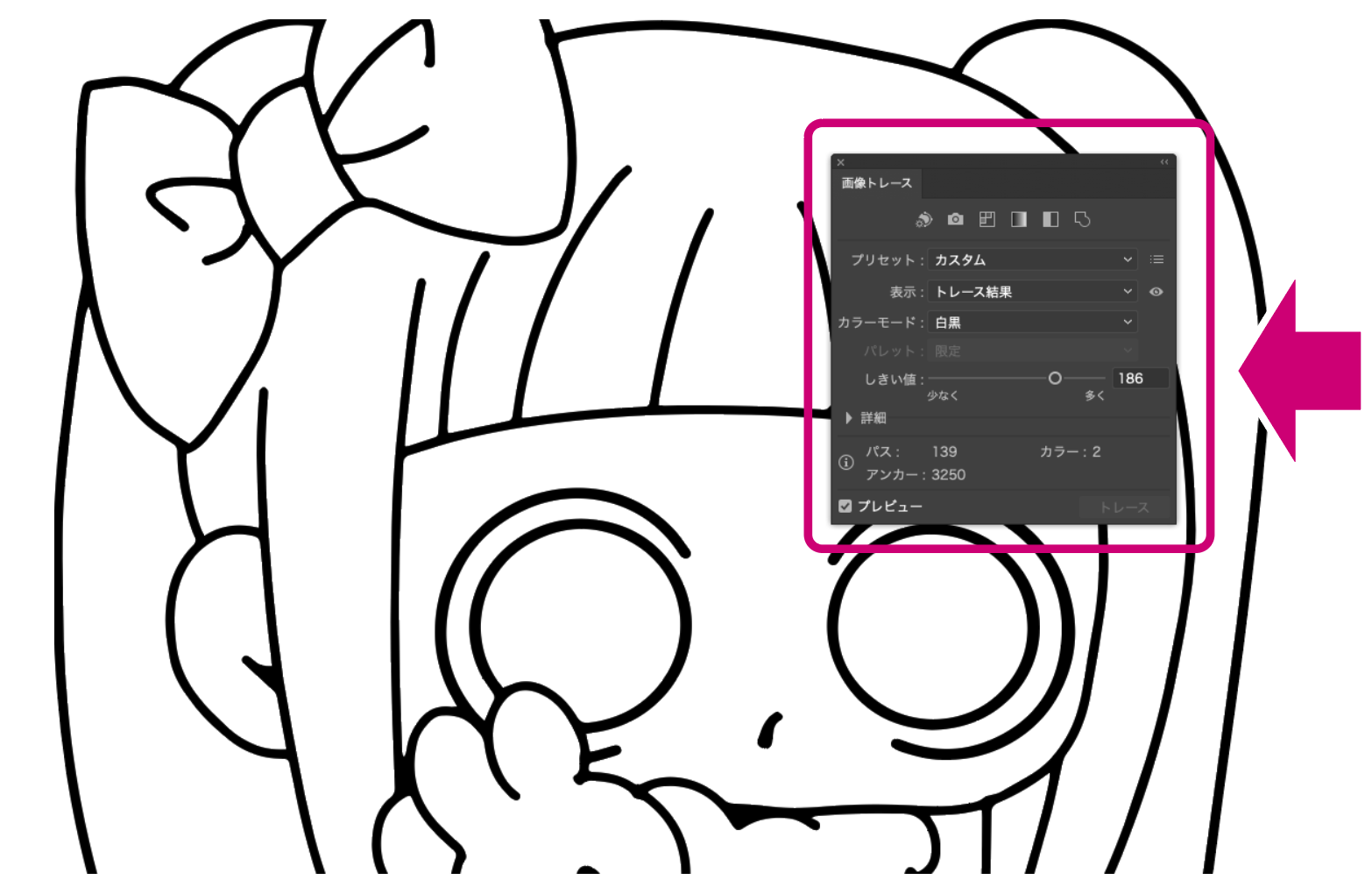 線画が完成したらIllustratorで読み込み「画像トレース」というパスを線画にする機能でパスに変換します。白黒だと比較的キレイに仕上げてくれることが多いです。