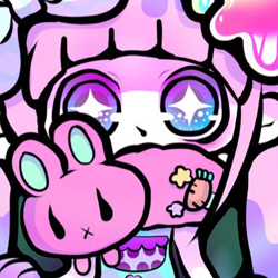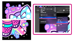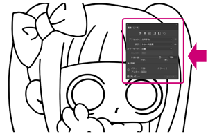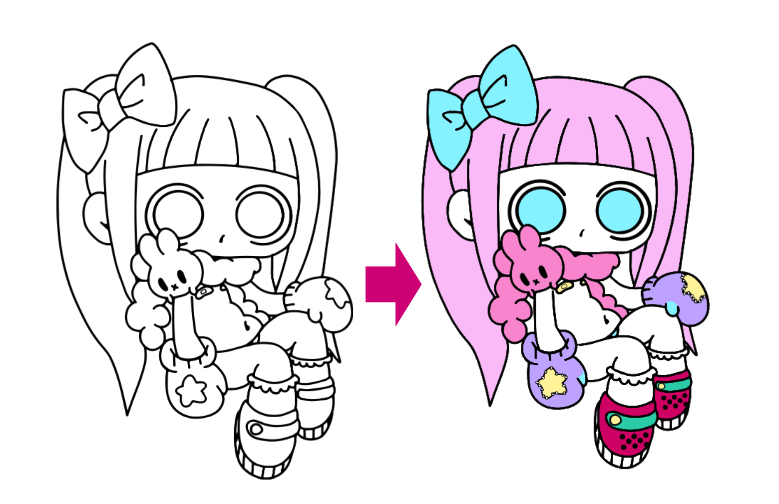 この段階で色や全体の形などコロコロ変えてちょうど良い色を探します。線画を微調整し、外枠だけ太めにしました。クリッピングマスクで目の中やリボンや髪に柄を足していきます。ここで塗りブラシツールなどを使って前髪をちょっと重めに描き換えてみました。
