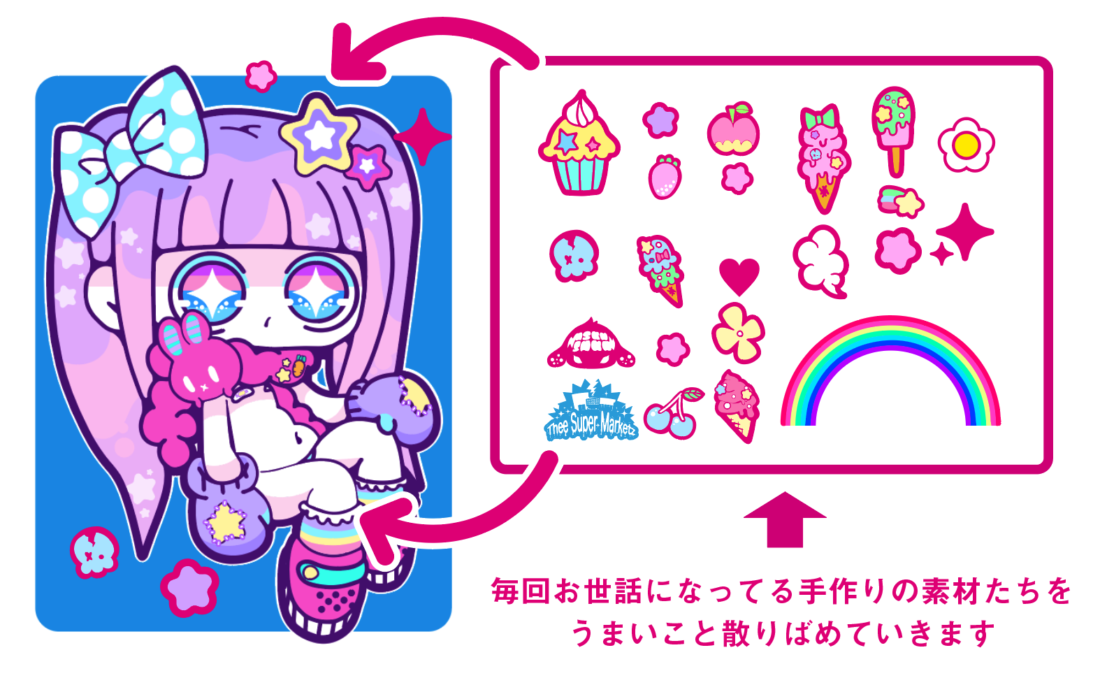 素材は以前に自分で手作りした物を使います。これもロゴ以外の素材はほぼiPadで落書きしてイラレで画像トレースして作りました。シール感覚でペタペタ追加していきましょう。星やキラキラの様な同じデザインを使う場合はoptin (Alt) + ドラッグで量産できて便利!!!