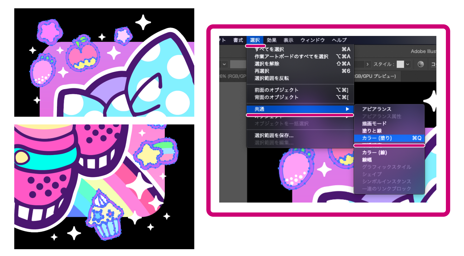 配置した後、素材や背景の色味を調整していきます。すべてのオブジェクトの同じ色を選択し、まとめて色を変更します。選択→共通→カラー(塗り)の機能を使えば選択している同じ色を一度に選択できて便利!