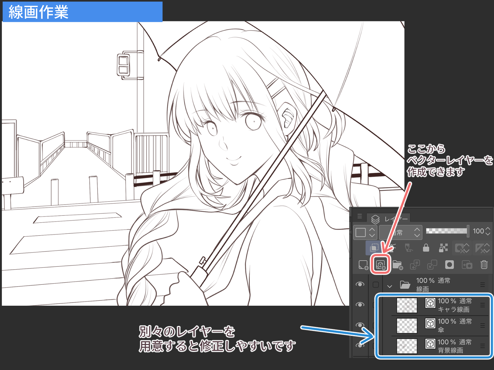 線画作業にはCLIP STUDIOの「主線も水彩も厚塗りも一本でやる怠けものブラシ」をダウンロードして使っています。「キャラクター」「傘」「背景」で別々のベクターレイヤーを用意して描いていきます。