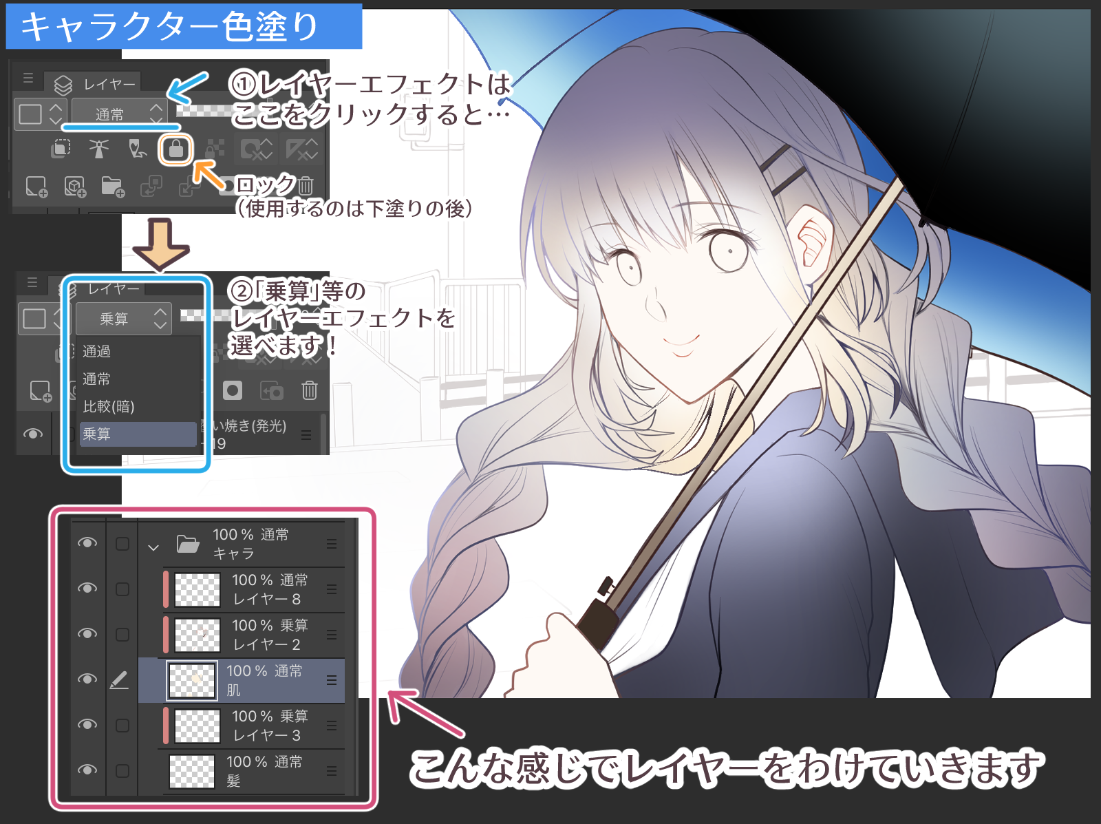 キャラクターのパーツごとにレイヤーをわけて色塗りをしていきます。今回は「肌」「髪」「服」「傘」の4つです。最初に分けておくと後でミスした時や色変更したい時に作業が楽になります。
