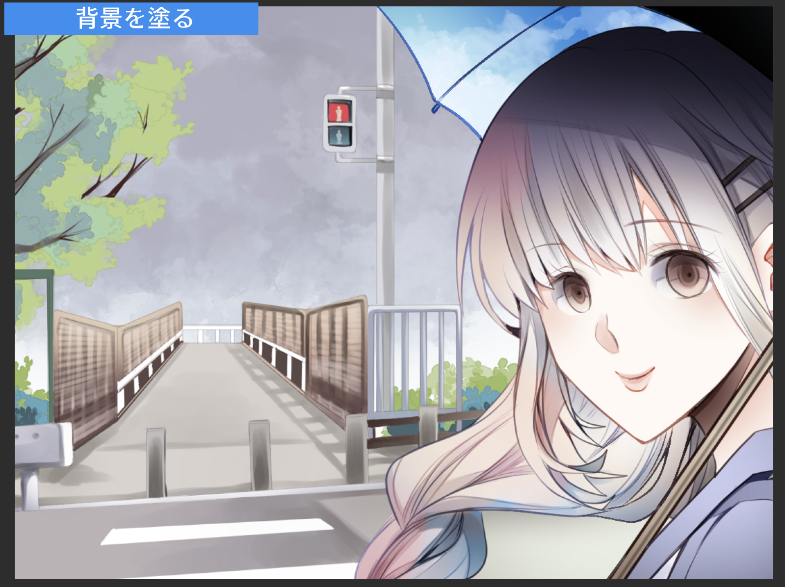 雨の日に傘をさす少女のイラストの制作行程をご紹介していきます。