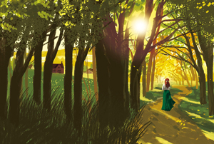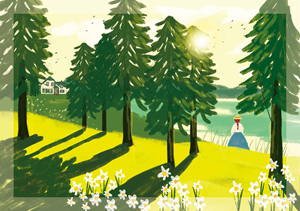 「自由にラフを描いて」とのことだったので、まずは日本語版『アンの青春』を読んだ後、Photoshopでカラーラフを作成して提出。小説全体から漂う幸福感を表現するため、グリーン・ゲイブルズに向って歩くアンを明るい配色で描きました。