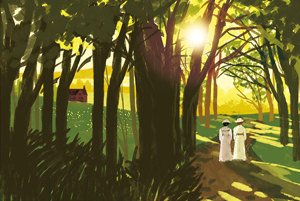 「子供っぽすぎる、もっと大人のイメージで」とのフィードバックをいただいたので、それをふまえて再ラフを提出。アンとダイアナが話をしながら森の小道を歩いているシーンです。