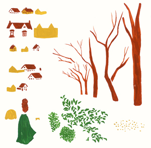 ケント紙にアクリルガッシュでパーツを描き、スキャンで取り込みます。