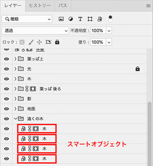 例えばこの「木」というスマートオブジェクトのいずれかをダブルクリックすると。