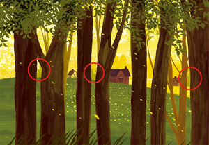 それぞれのパーツをPhotoshop上で合成していきます。「光」「地面」「木」など、自分で分かるフォルダ名をつけて、大きなパーツごとに分けて制作します。繰り返し使うモチーフは「スマートオブジェクト」という機能を使って個別で編集できるようにしておきます。