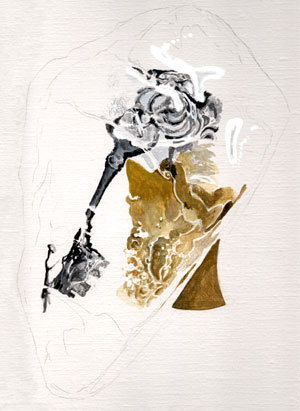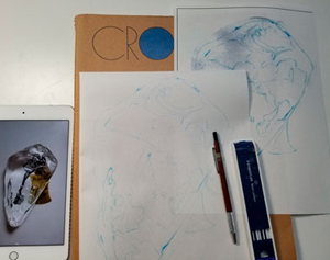 まず写真を撮ります。氷の中に鍵があるような写真を撮り、それを見ながらラフを描きます。大雑把にアタリをつける感じです。使用するのはクロッキー帳と青い芯のホルダー。青い芯を使うのは何故かやる気スイッチが入るからです。