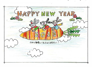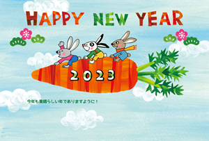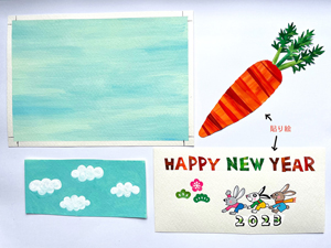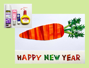 貼り絵:人参、賀詞(HAPPY NEW YEAR)。