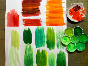 ラフより大きめに、貼り絵がしやすいサイズで制作。オレンジ系とグリーン系の絵の具をコピー紙に塗り 貼り絵の元になる素材を作る。